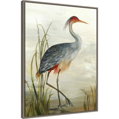 heron standing in profile on the banks of a body of water. Is he looking at his next meal or his true love? We do not know, but the plants have parted, making a space for him as he decides what to do next. This Amanti Art canvas art print was created by Aimee Wilson and printed by Amanti Art in Madison WI. The canvas is stretched by hand and finished with a float frame. Individually made using traditional custom framing techniques, it has the quality you would expect from your local frame shop. Because of our attention to detail and focus on artistry, architects, interior designers, and homeowners alike choose this framed canvas artwork to create beautiful living spaces.