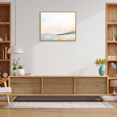ART DESCRIPTION: With barely a cloud in sight, a hush falls over this pale landscape. Gentle waves stream across an abstract sandy shoreline, trickling over dark rocks in the distance, the only contrast to the blushing sky and peaceful water. This Amanti Art canvas art print was created by Sue Schlabach and printed by Amanti Art in Madison WI. The canvas is stretched by hand and finished with a float frame. Individually made using traditional custom framing techniques, it has the quality you would expect from your local frame shop. Because of our attention to detail and focus on artistry, architects, interior designers, and homeowners alike choose this framed canvas artwork to create beautiful living spaces.