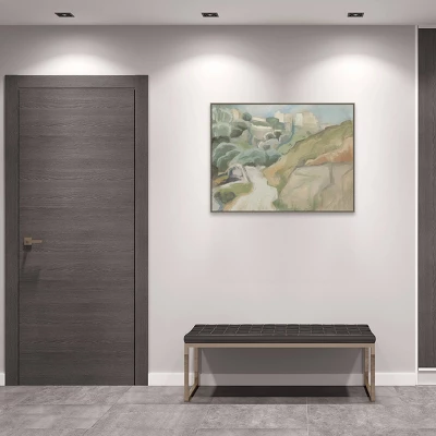 ART DESCRIPTION: A soft pastoral landscape in sage, emerald and grass-green shades sits peacefully under a pale azure sky. Rolling hills cover the land, bisected by a winding path colored in beige and gray shades. Tall gray buildings are visible in the distance. This Amanti Art canvas art print was created by Urban Road and printed by Amanti Art in Madison WI. The canvas is stretched by hand and finished with a float frame. Individually made using traditional custom framing techniques, it has the quality you would expect from your local frame shop. Because of our attention to detail and focus on artistry, architects, interior designers, and homeowners alike choose this framed canvas artwork to create beautiful living spaces.