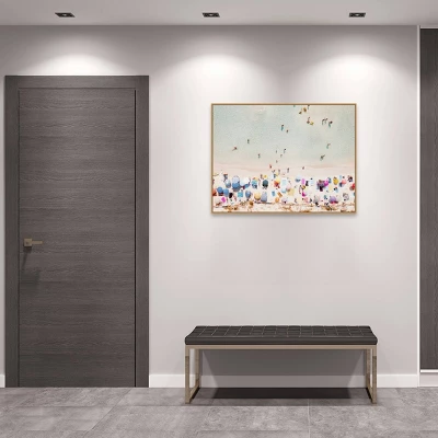 ART DESCRIPTION: Bright beach umbrellas line up in the sand while intrepid waders splash into the crystal clear waters. A rippling wind brings a much needed breath of fresh air to this summer day. This Amanti Art canvas art print was created by Krista Broadway and printed by Amanti Art in Madison WI. The canvas is stretched by hand and finished with a float frame. Individually made using traditional custom framing techniques, it has the quality you would expect from your local frame shop. Because of our attention to detail and focus on artistry, architects, interior designers, and homeowners alike choose this framed canvas artwork to create beautiful living spaces.